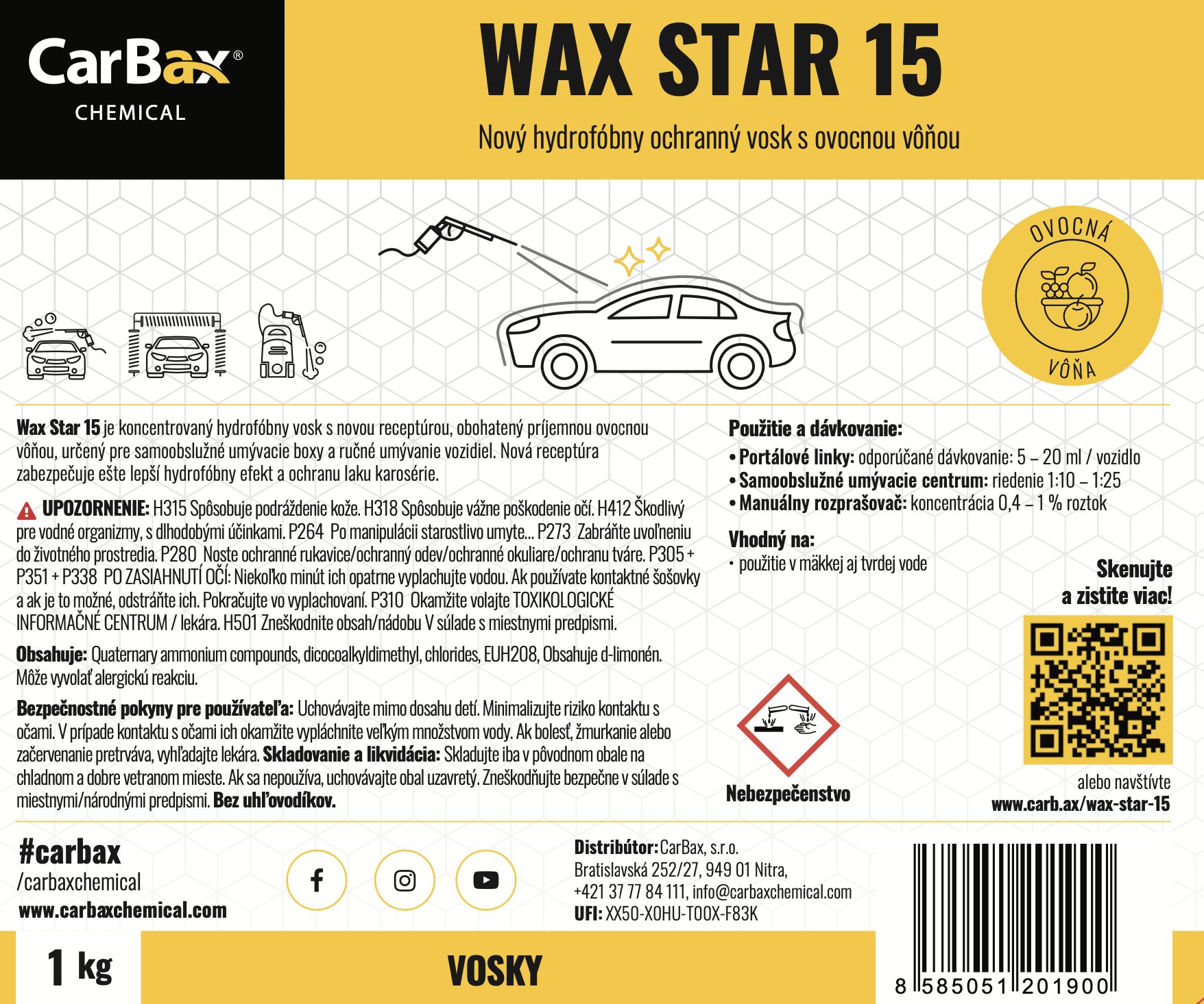 Koncentrovaný hydrofóbny vosk s novou receptúrou, obohatený príjemnou ovocnou vôňou, určený pre samoobslužné umývacie boxy a ručné umývanie vozidiel.